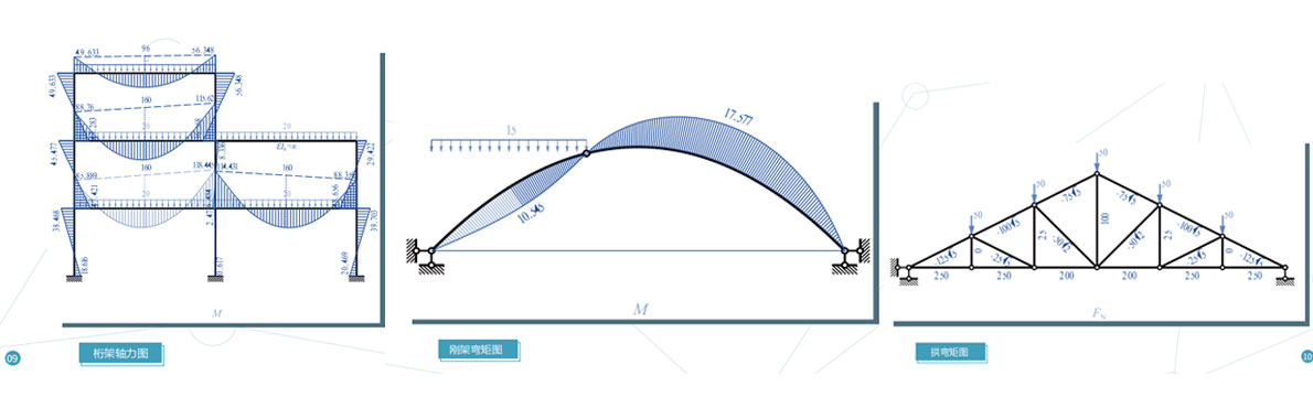 平台已开放结构力学课程中常见力学模型支持, 包括静定及超静定梁、刚架、桁架、拱、组合结构的构建, 分析模式支持几何组成分析、静定结构内力分析 、静定结构位移计算、 静定结构变形分析、超静定结构力法分析、超静定结构位移法分析、力矩分配法分析、 影响线、内力包络、自由振动分析、强迫振动分析等, 涵盖了除稳定分析之外,课程体系90%以上的知识点。