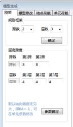 选择或输入框架跨数、层数,并输入各层层高和各跨跨长,即可生成平面规则框架;规则框架形成后,可在其基础上进一步形成复杂结构。